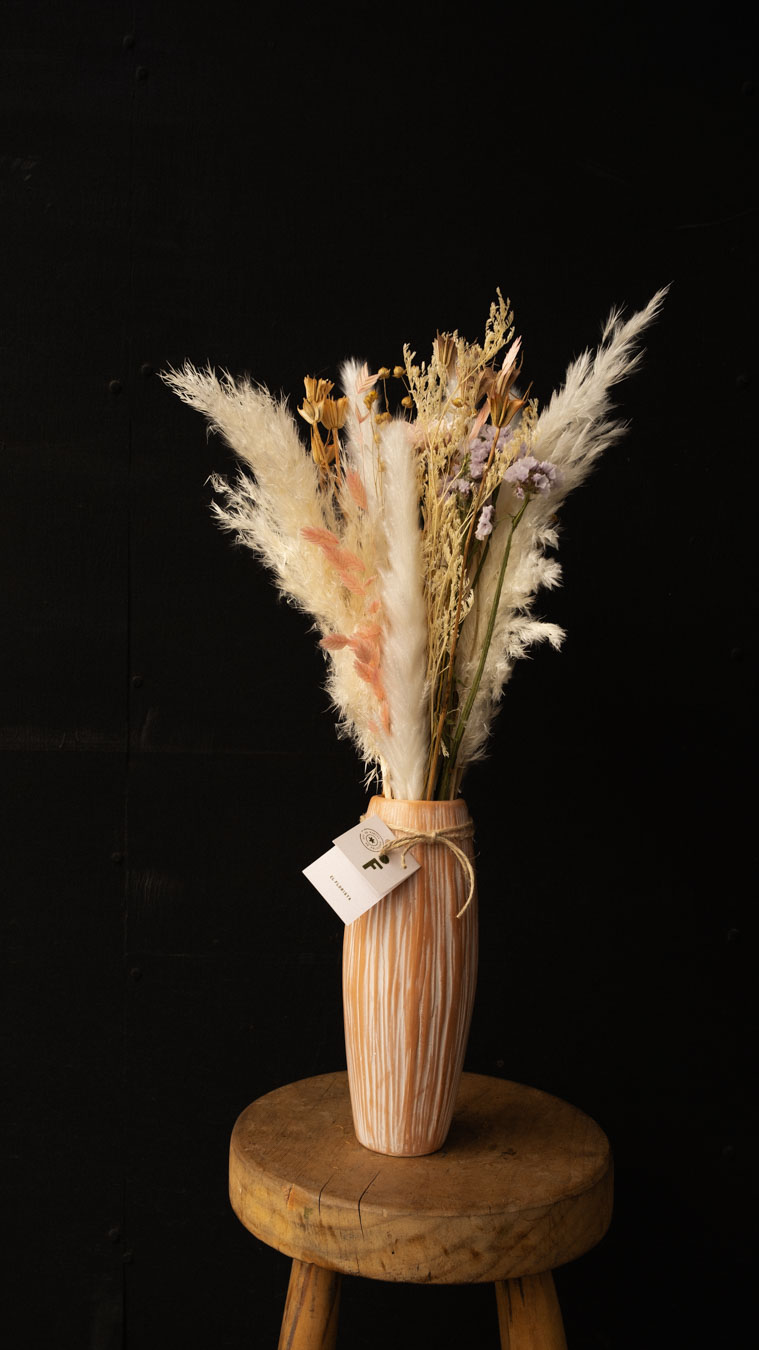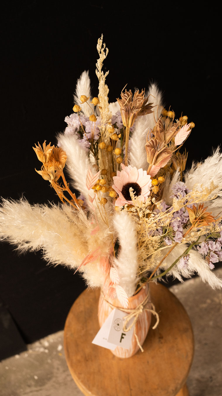 Es un arreglo de flores secas con un girasol preservado en un jarrón de cerámica, ha sido diseñado meticulosamente para aportar calidez y estilo a cualquier rincón del hogar.