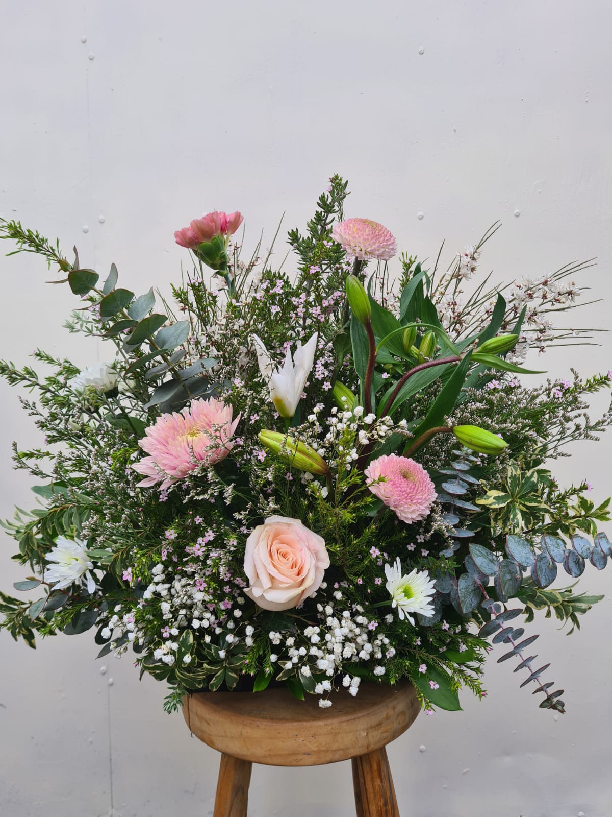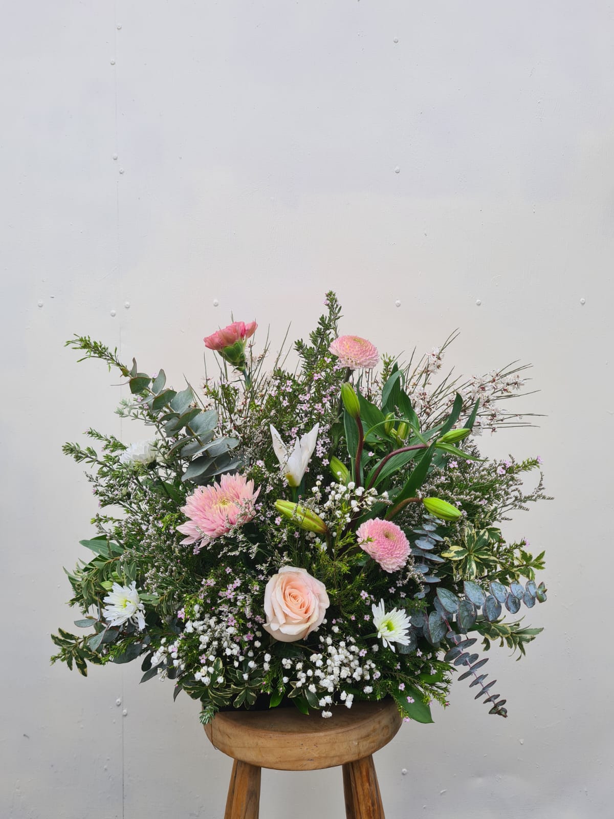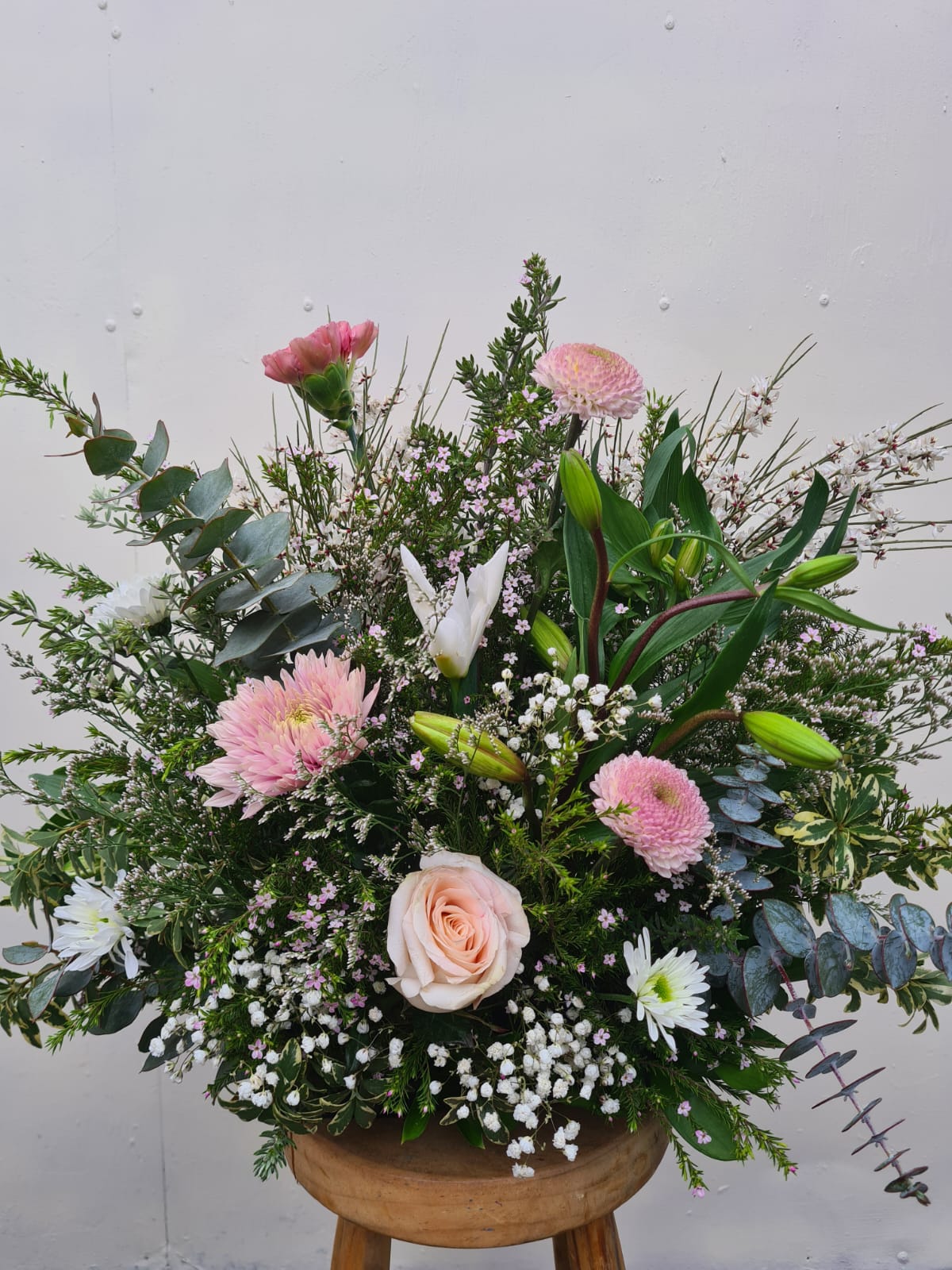 Es un arreglo floral en tonos rosados. pensado para impresionar a primera vista. Contiene una cuidada selección de las flores más lindas de la temporada, elegidas a diario en nuestro taller para garantizar frescura y belleza. Toma en cuenta que la foto es referencial y utilizamos flores de temporada.