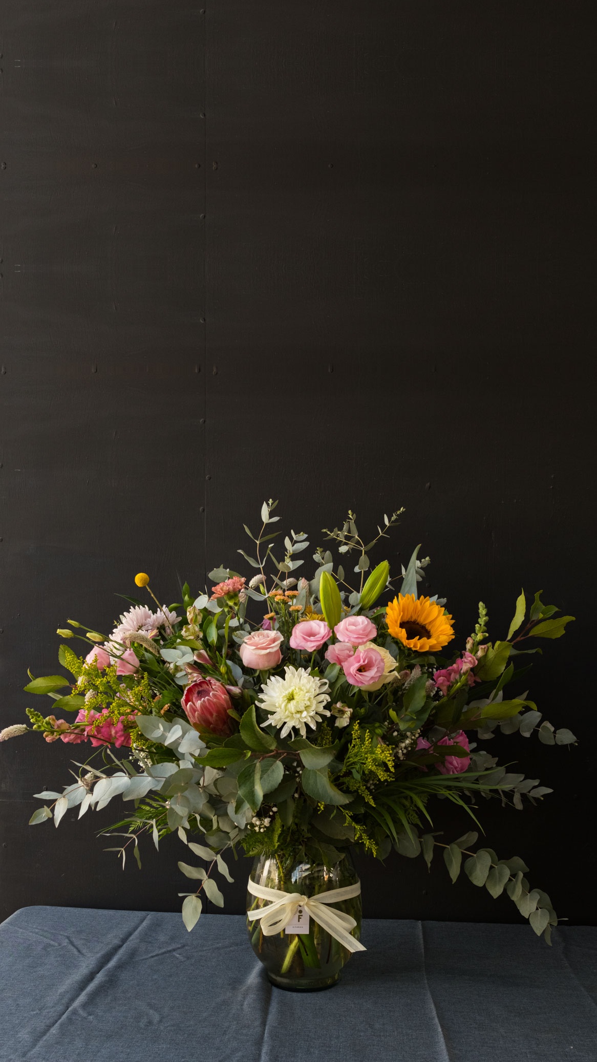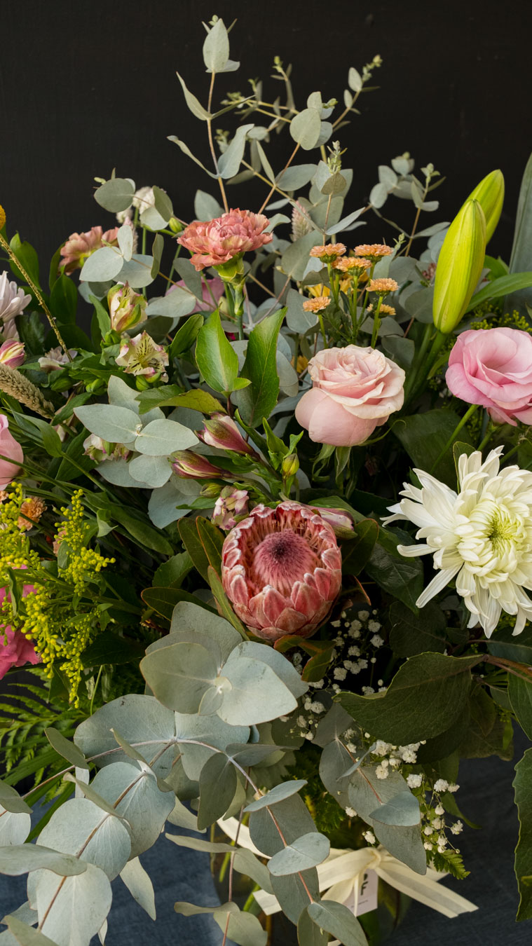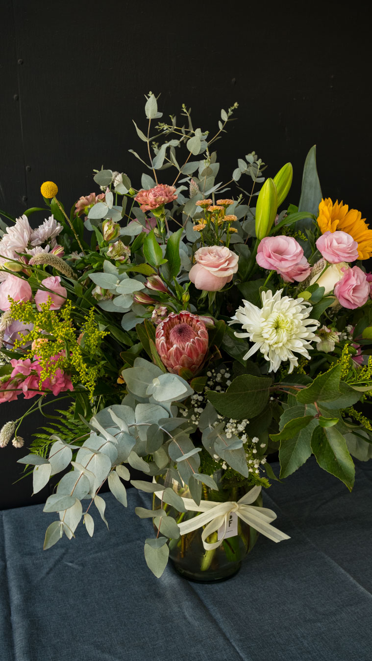 Es el más imponente de nuestra colección, diseñado para llenar un espacio grande de vida y color. Confeccionado con una dedicada selección de flores y follajes, algunos nacionales y otros importados; usualmente lo recomendamos para llenar grandes espacios y marcar hitos importantes como eventos o grandes celebraciones. IMPORTANTE: algunas flores o follajes pueden variar respecto a la foto que es referencial, ya que usamos materia prima de temporada que nos llega a diario. Lo puedes pedir también en color neutro por el mismo valor o en colores personalizados con costo adicional. Alto aproximado del arreglo: 80 cm. Consulta por WhatsApp 🌸  https://wa.me/56986481528