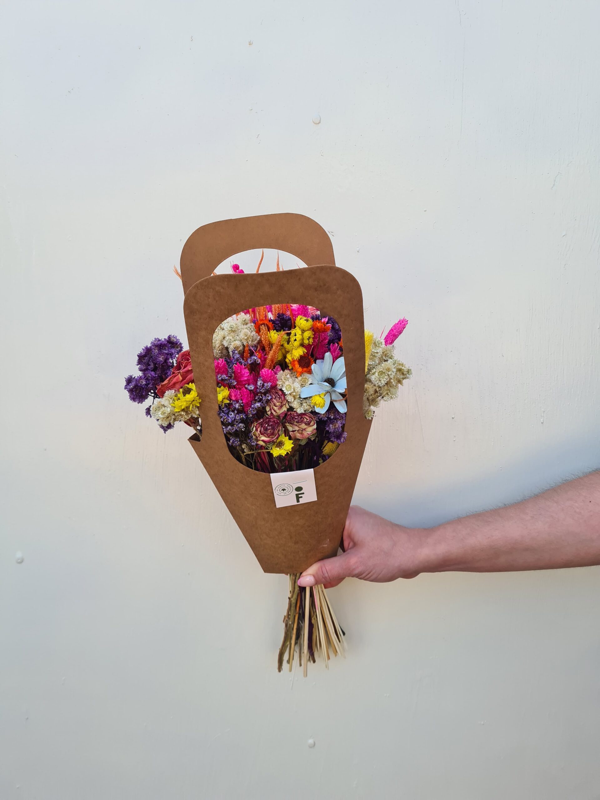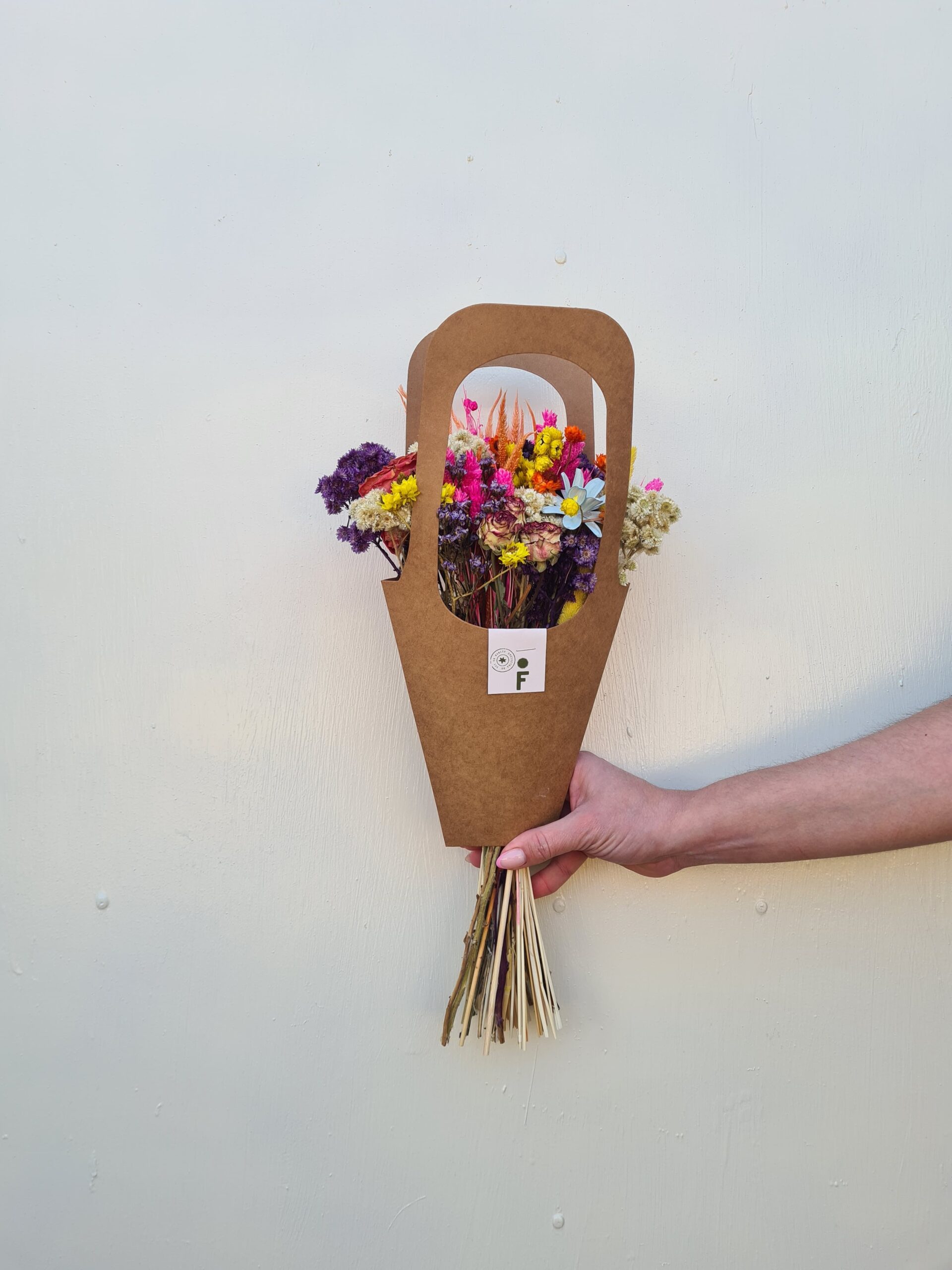 Un hermoso ramo en carterita, ideal para regalar con la paleta de colores favoritas, una mezcla de flores secas en tonos pasteles.
