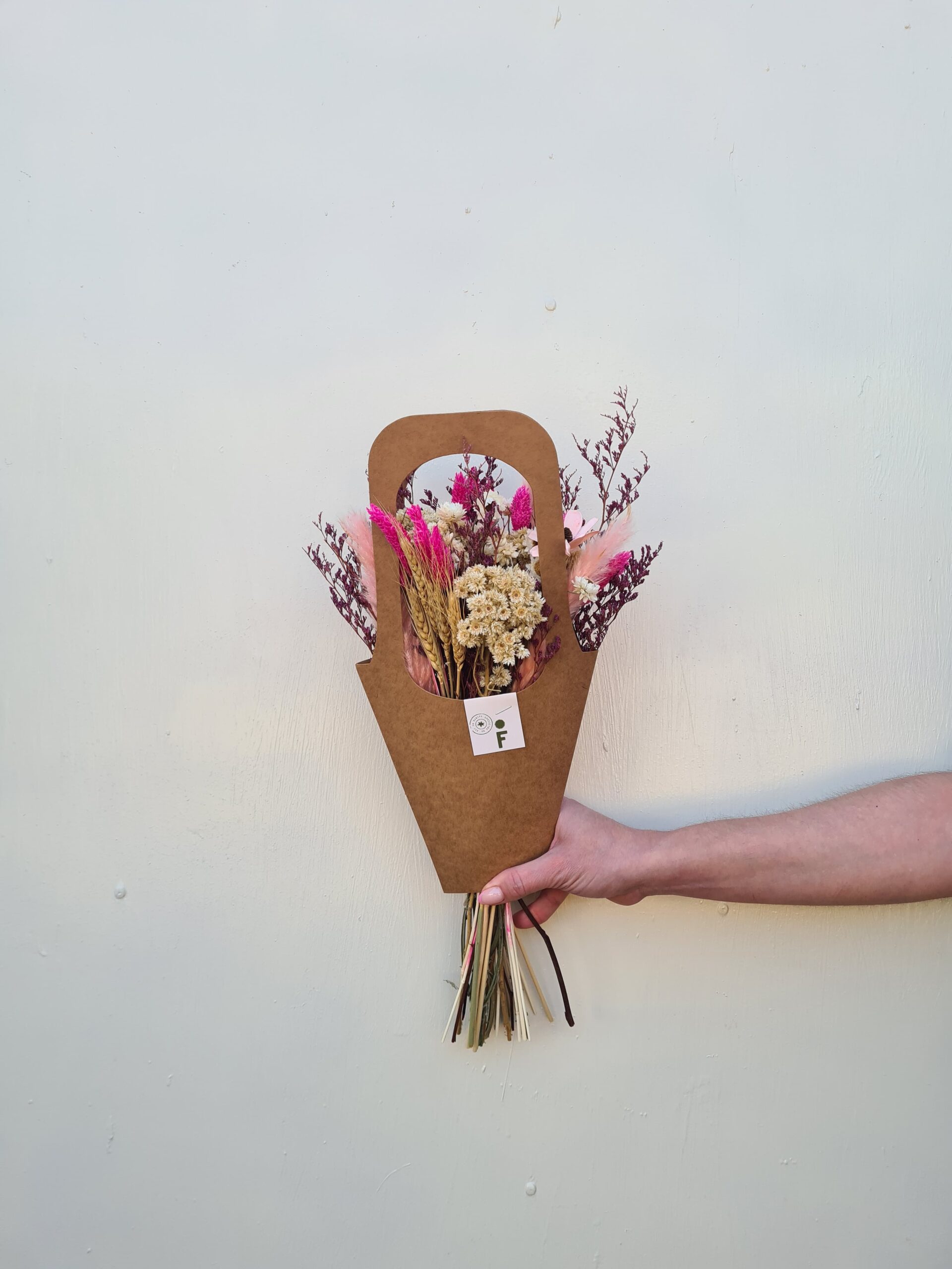 Incluye bunny tail, limoniun, Craspedia, Gypso,  Mini rosa seca, Estatice, Espiga  y más.
