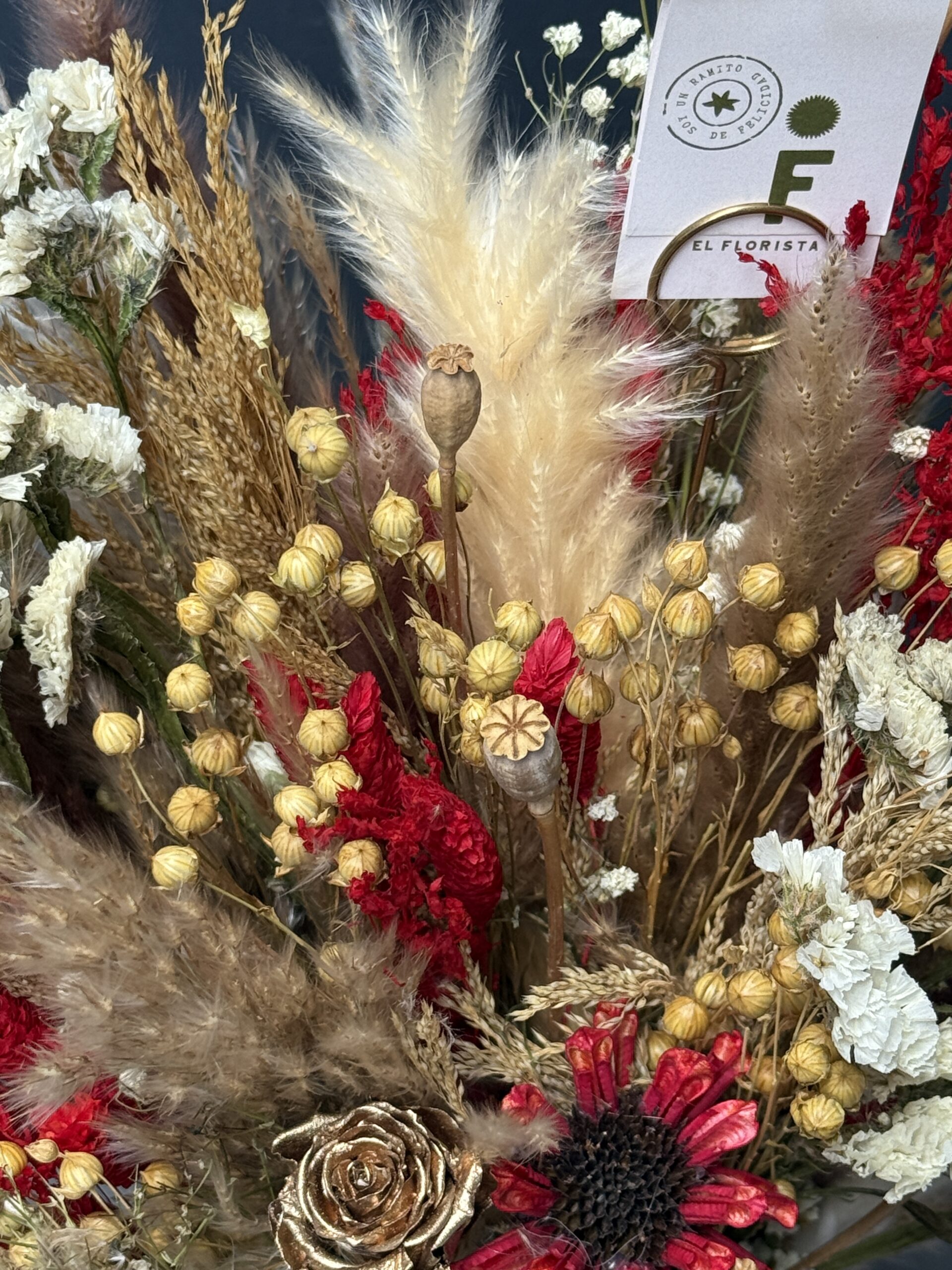 Es un delicado florero de cerámica de donde sale un pequeño pero hermoso arreglo de flores secas y preservadas que pueden durar meses.