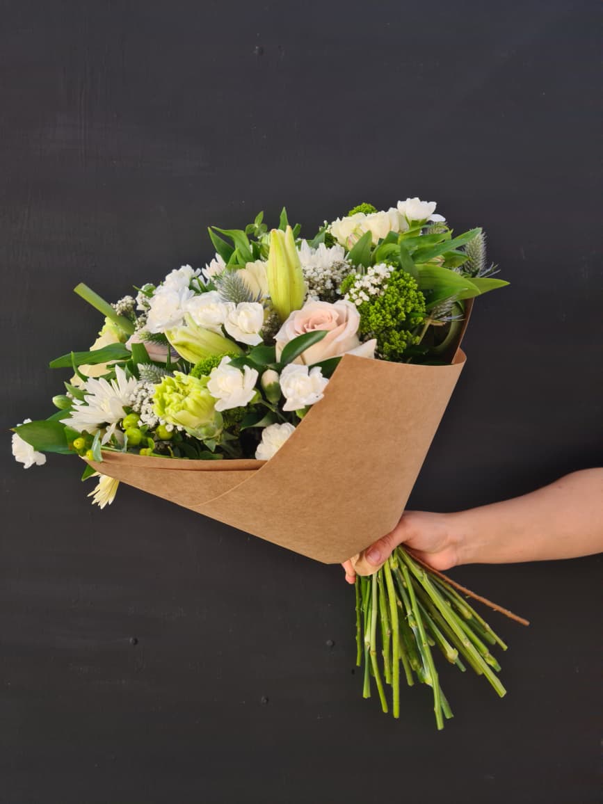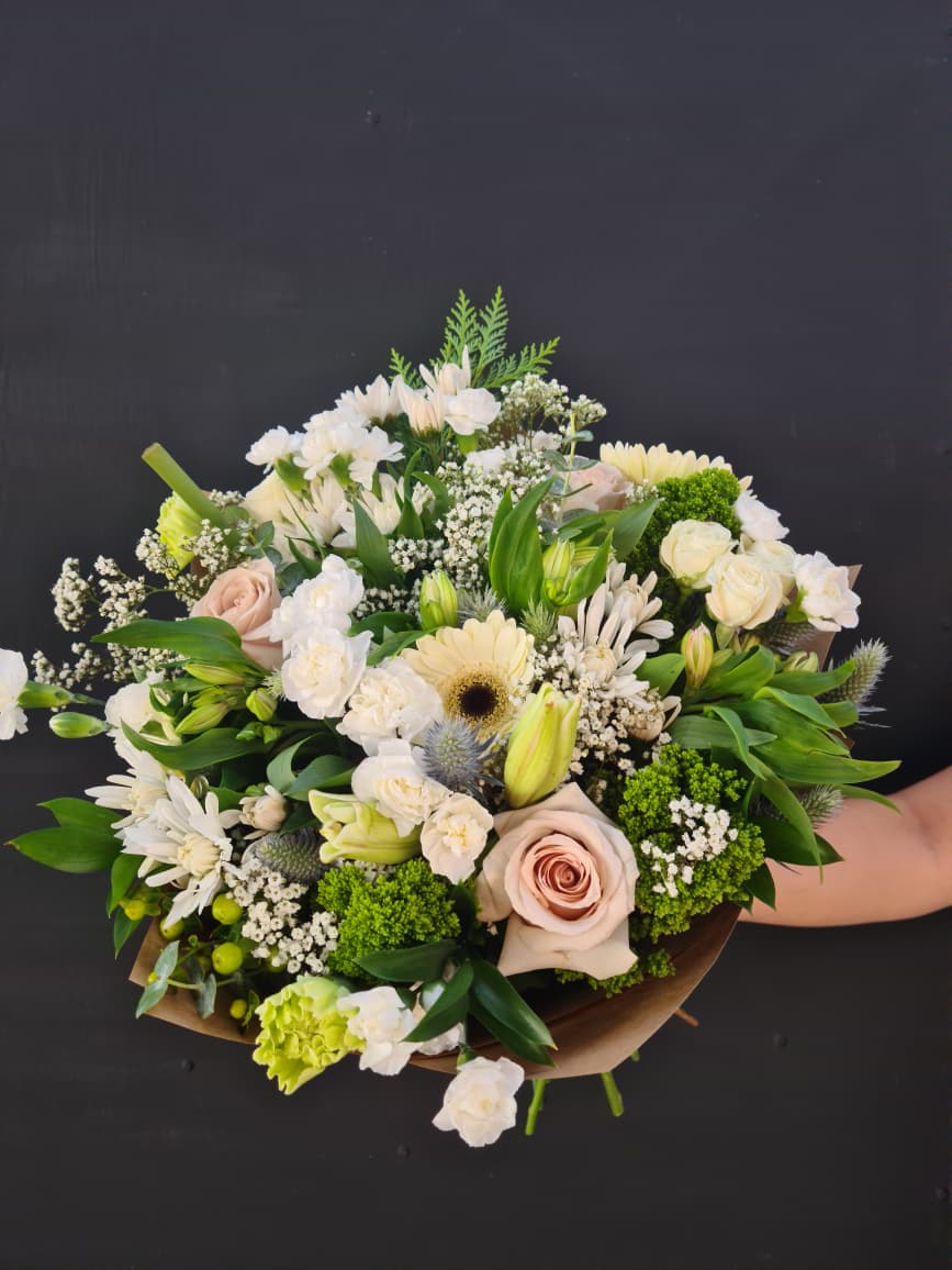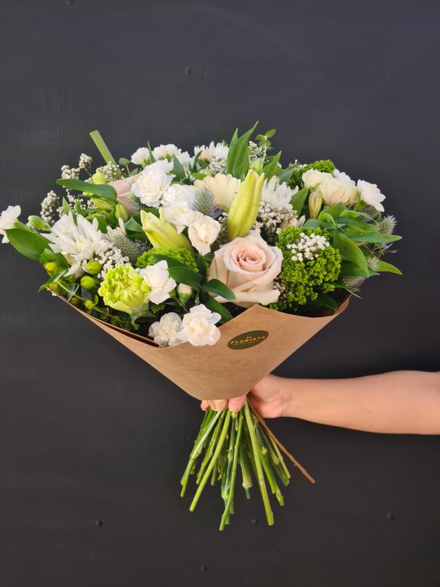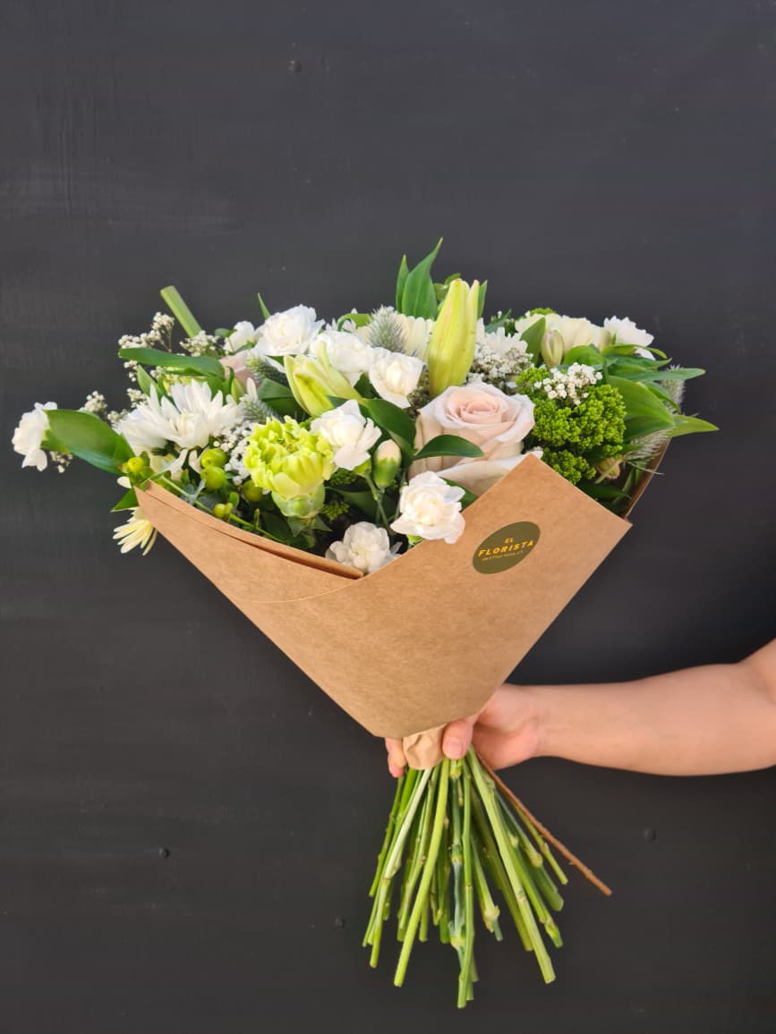 Un precioso ramo lleno de colores neutros con las mejores flores y follajes de la estación seleccionados al momento en nuestro taller, una sorpresa fuera de serie.