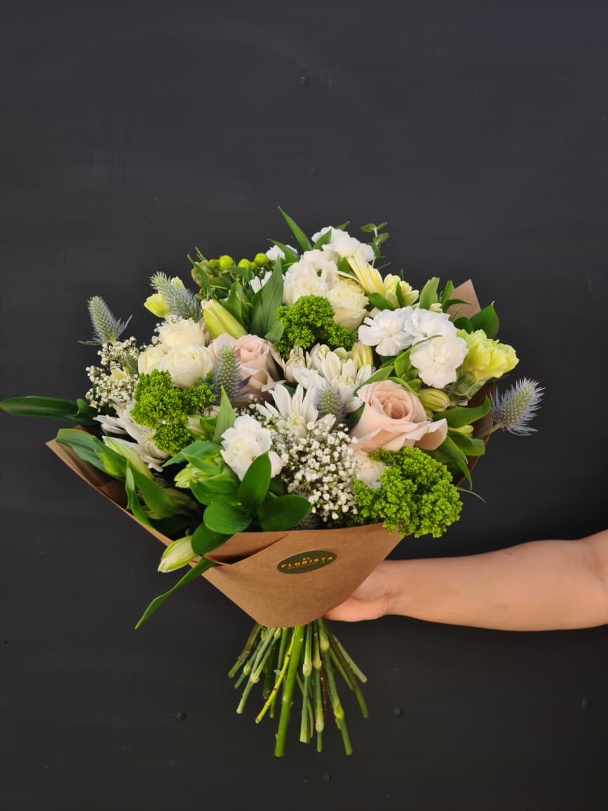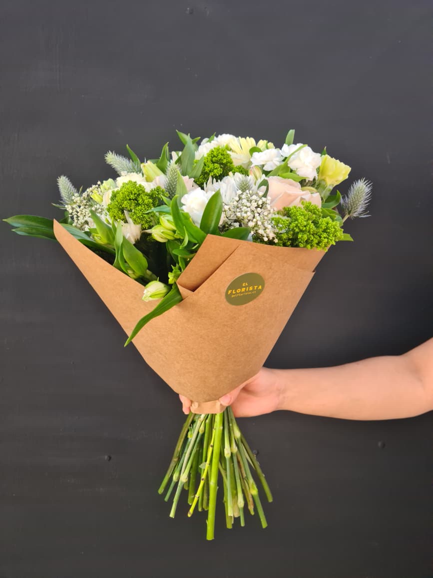 Un precioso ramo lleno de colores neutros con las mejores flores y follajes de la estación seleccionados al momento en nuestro taller, una sorpresa fuera de serie.