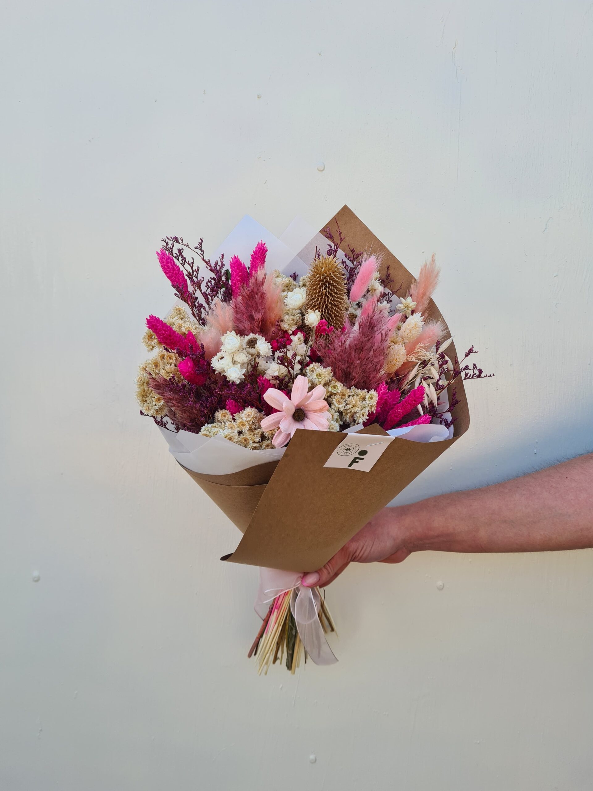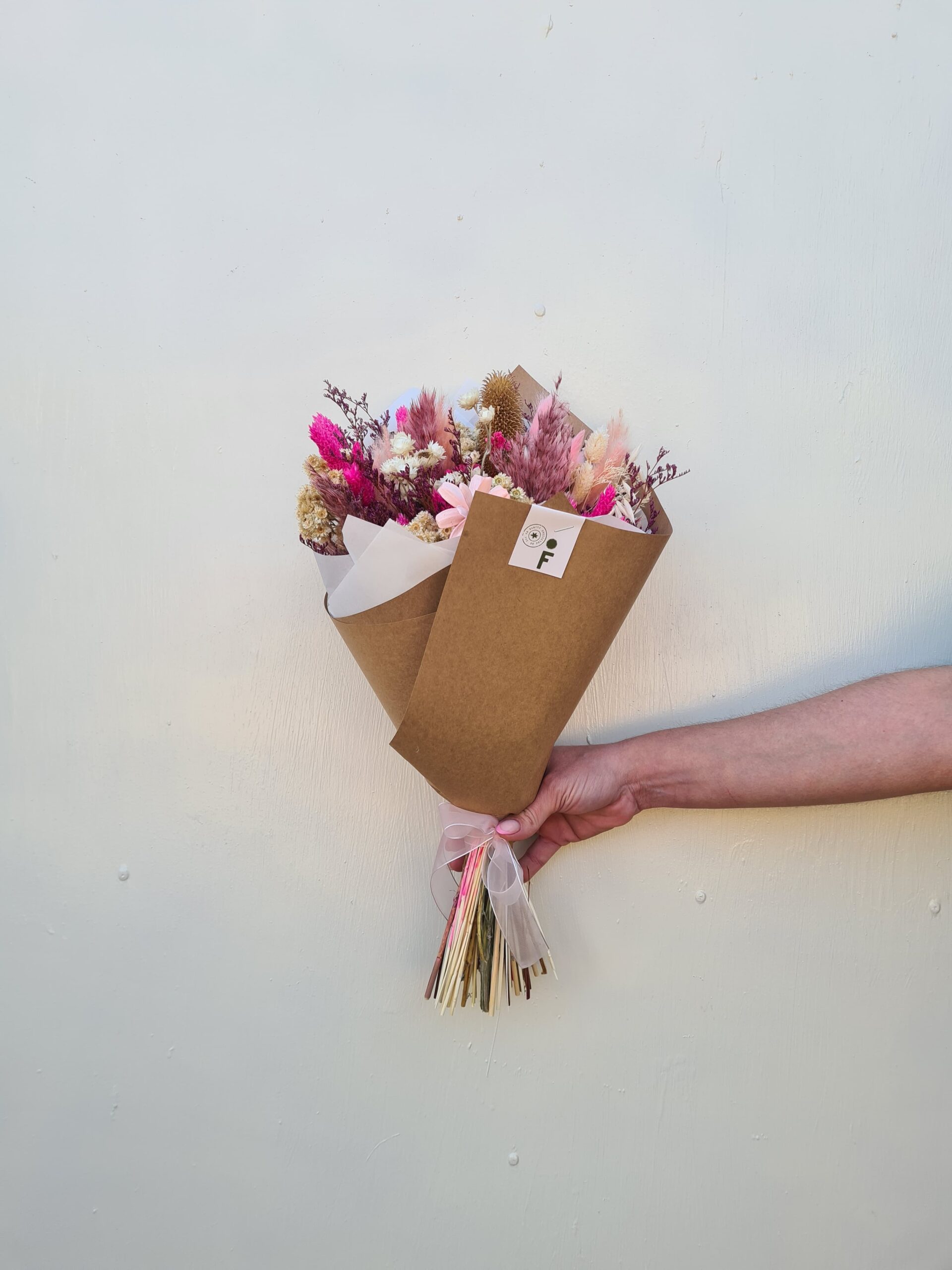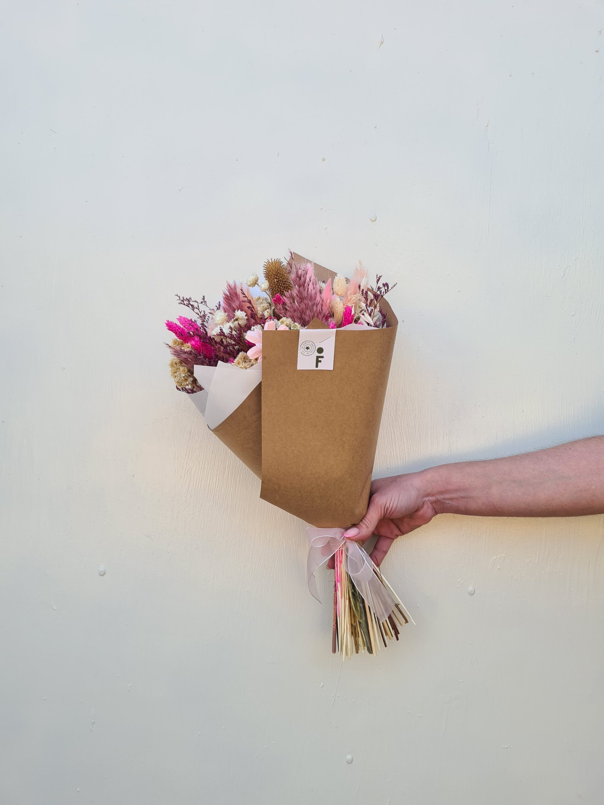 Incluye bunny tail, limoniun, Gypso, Mini rosa, Estatice, Espiga, Miscanthus y más.