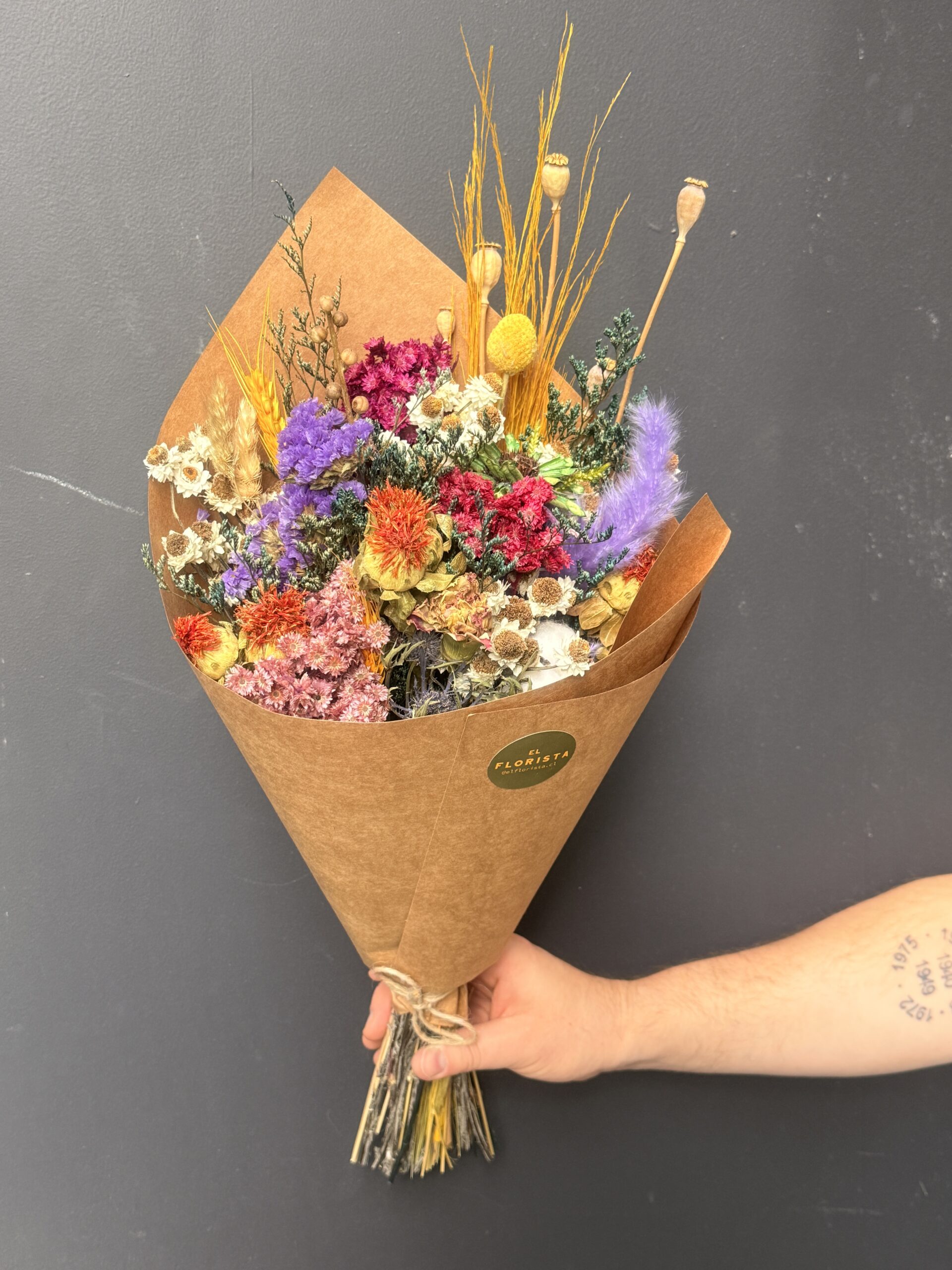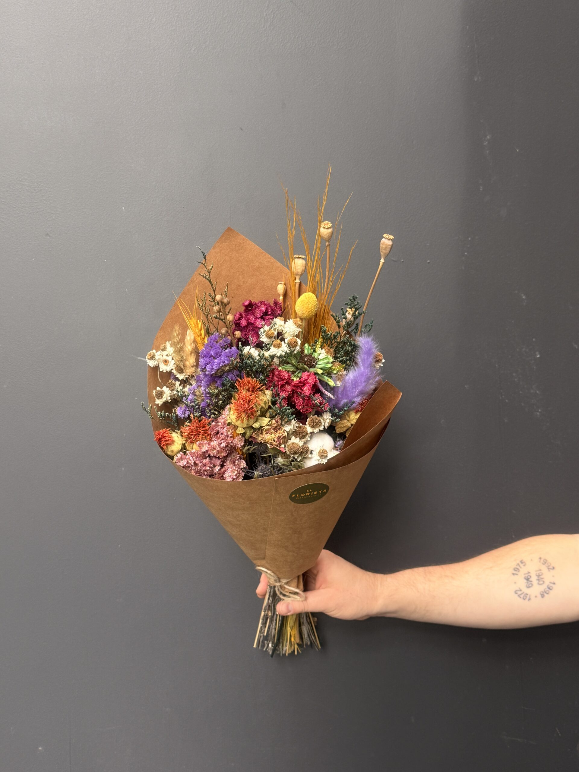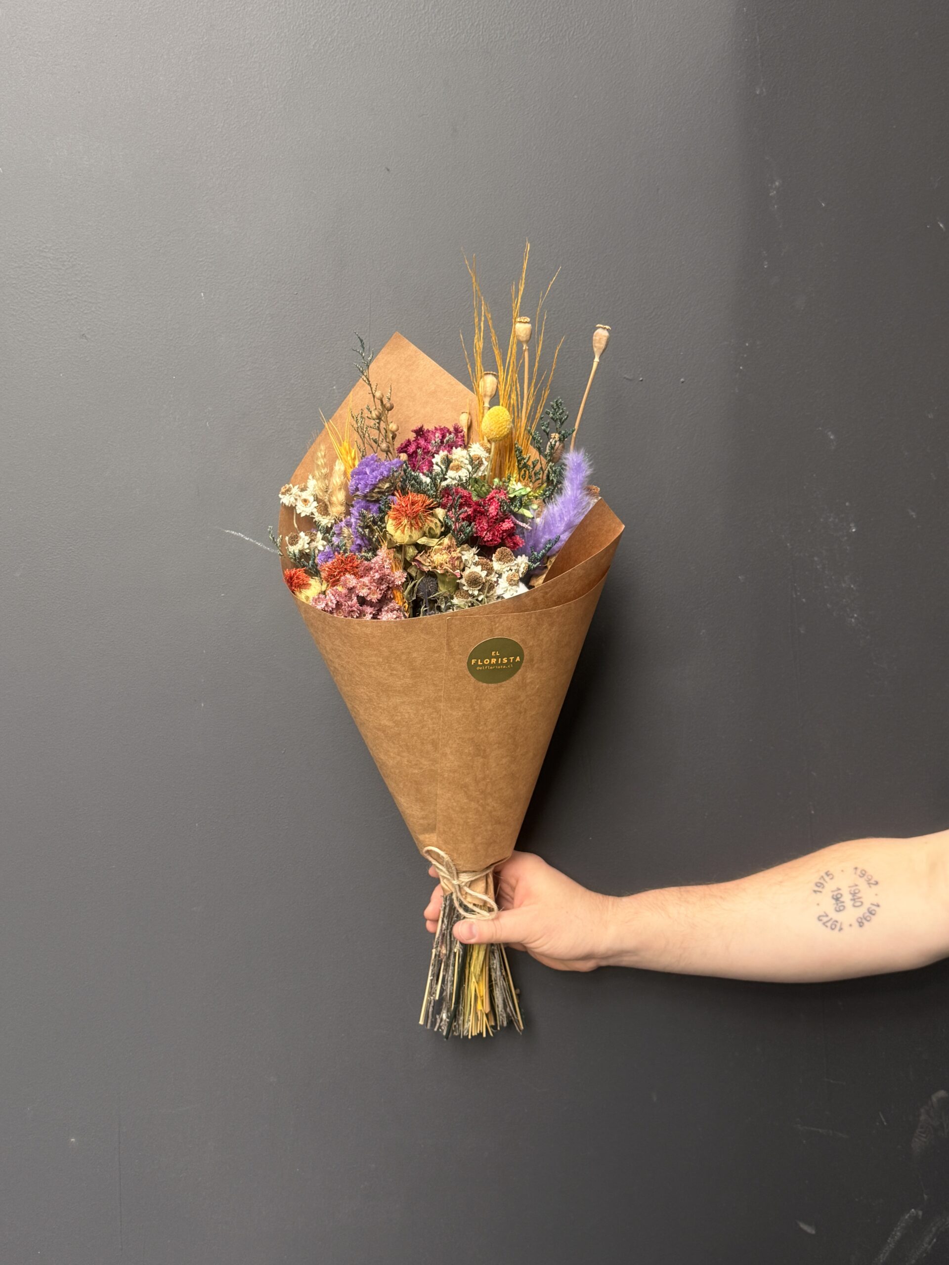 El ramo es referencial no identico, utilizamos flores de temporada se mantiene los colores. Incluye bunny tail, limoniun, Craspedia preservada, Gypso preservada,  Mini rosa seca, Estatice, Espiga, Miscanthus y más.