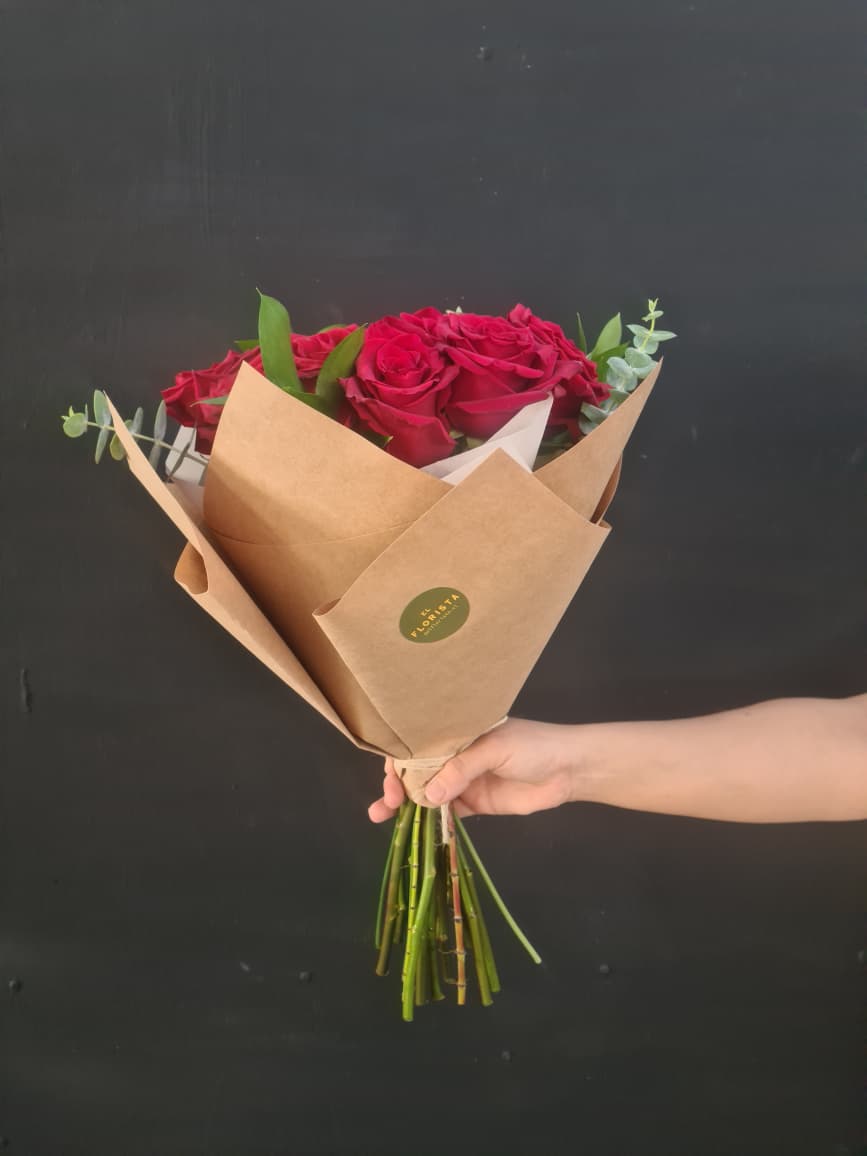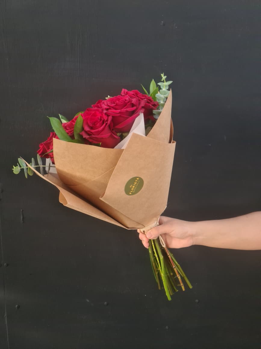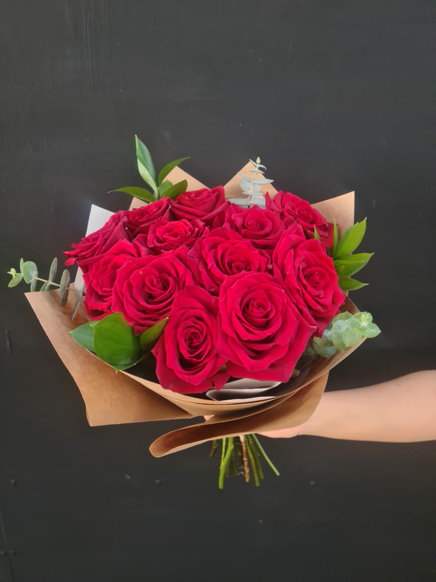Rediseñamos el típico ramo de rosas rojas a nuestro estilo, fuera de lo común. Un ramo lleno de movimiento y texturas que contiene 12 rosas rojas.